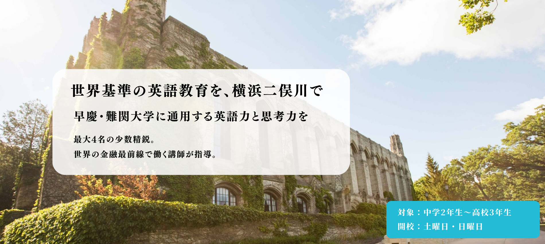 中高生を対象とした少数精鋭の環境で、大学受験時に早慶合格を念頭に置いた英語力・思考力・教養を同時に伸ばす新しい英語塾です。